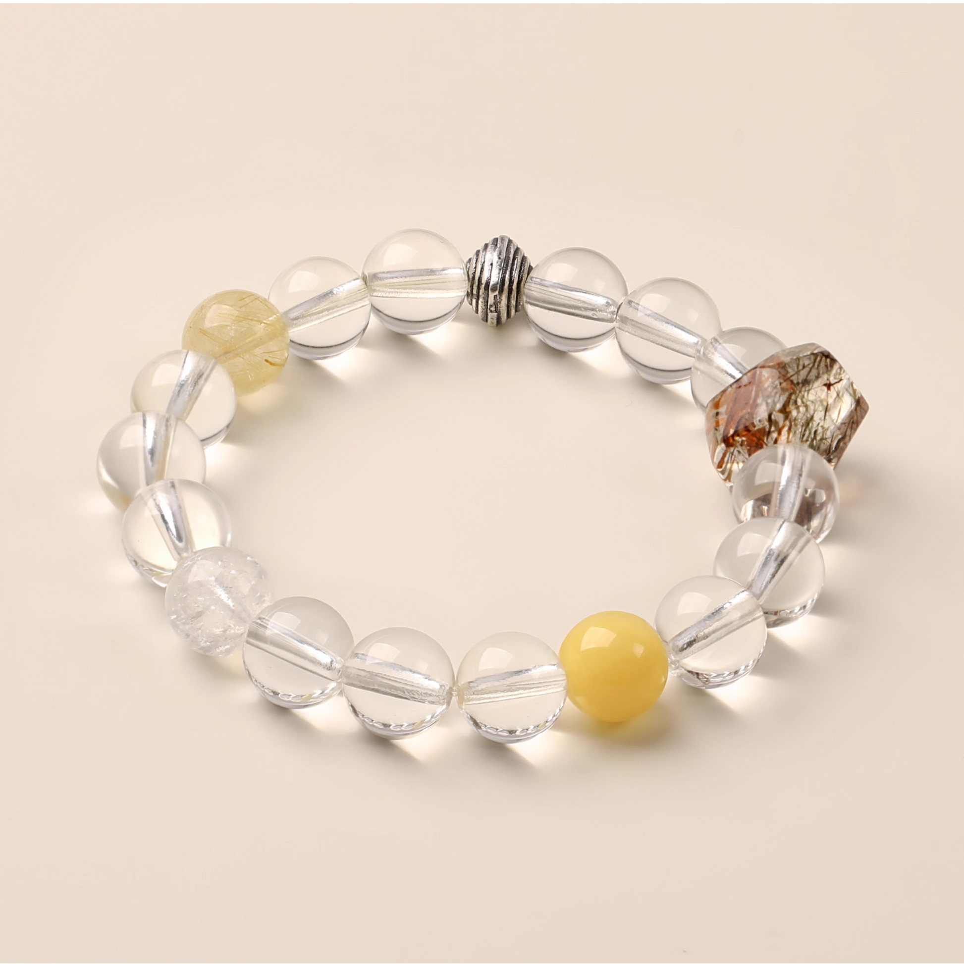 - Materials: Clear Quartz, Golden Rutilated Quartz, Amber, Black Super Seven, White Agate, S925 Sterling Silver.